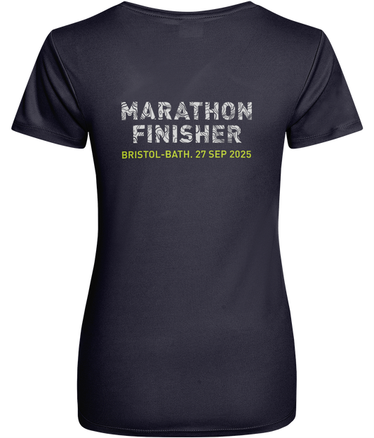 Women's Navy Active T Shirt Bristol-Bath Marathon Finisher with emblem
